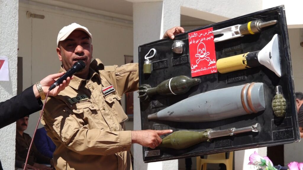 أقامت فرق “الصليب الأحمر” محاكاة ميدانية للتوعية بمخاطر المخلفات الحربية، في إحدى مدارس قضاء شط العرب، شرقي البصرة، بمناسبة اليوم العالمي لمكافحة الألغام.