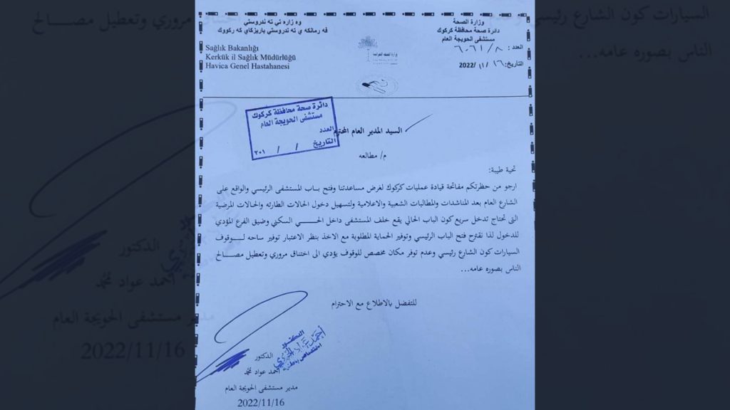 مدير مستشفى الحويجة احمد عواد قال لشبكة 964: “طالبنا عبر كتاب رسمي بفتح الباب المطل على الشارع العام، بدل الباب المطل على الحي السكني ليتسنى لنا إسعاف الحالات الطارئة بأسرع وقت ممكن”.