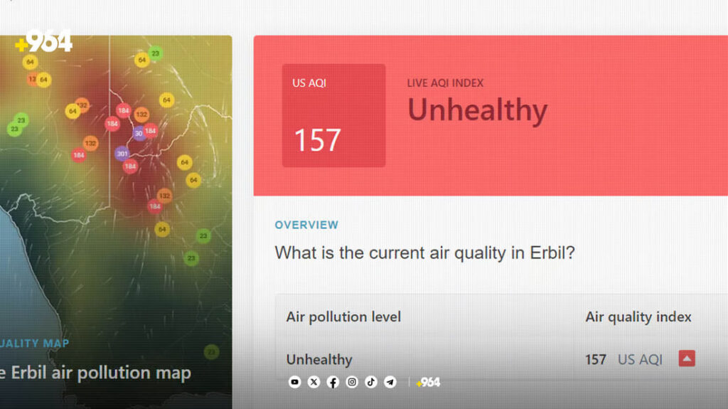 بحسب تطبيق الطقس IQAir، وصل مستوى تلوث الهواء في أربيل إلى 157 درجة عند الساعة 9:20 من صباح الأربعاء.