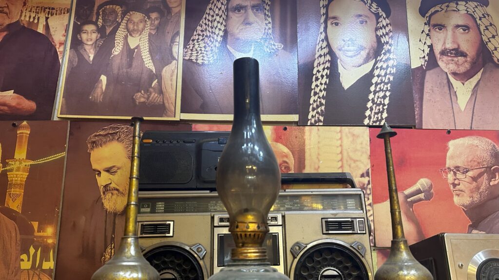 على بعد 1 كم من مرقد الإمام الحسين، يقع مقهى “تراث كربلاء”، الذي سعى أصحابه لملئه بالصور النادرة للمدينة، فضلاً عن صور الشعراء والمنشدين وشخصيات المدينة.