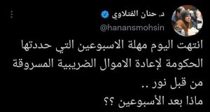 بعلامتي استفهام حنان الفتلاوي تخاطب الحكومة بعد انقضاء “مهلة نور” 2022-12-13 | 11:46 بغداد - 964 خاطبت النائبة في البرلمان حنان الفتلاوي، الاثنين، الحكومة العراقية، بتساؤل، بعد انقضاء المهلة التي حددها رئيس مجلس الوزراء لإعادة أموال الأمانات الضريبية المسروقة.