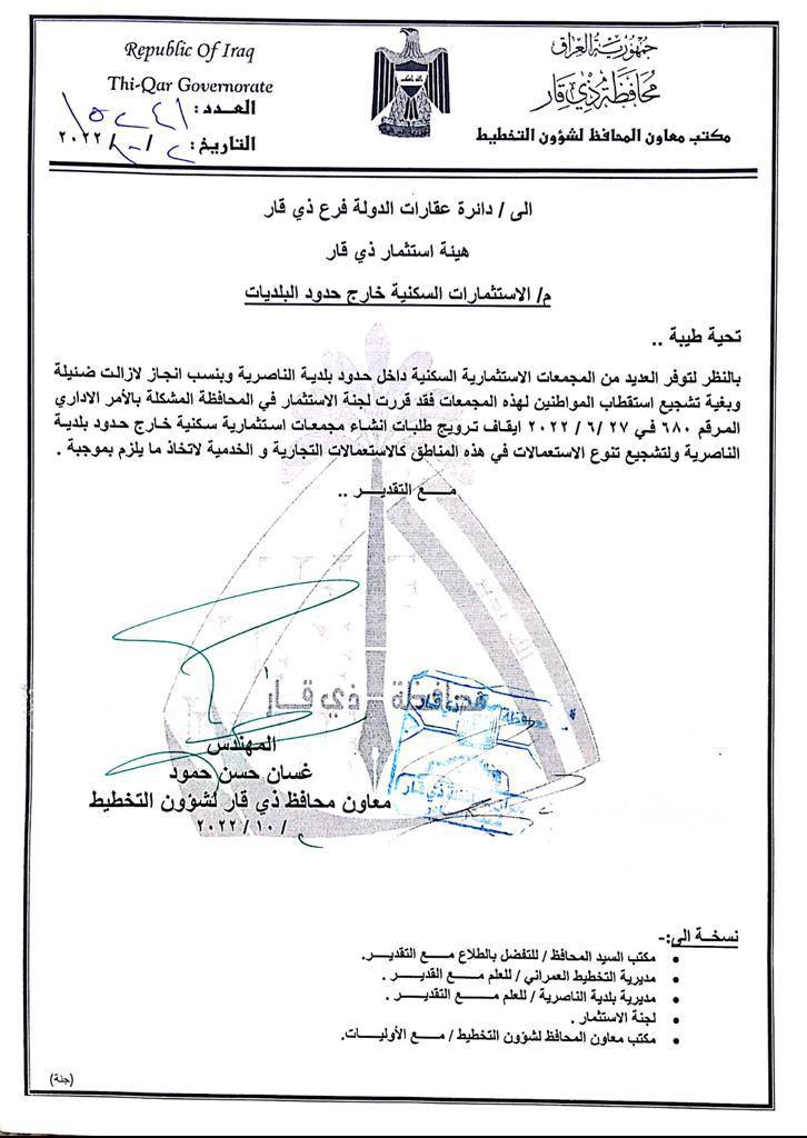 وجهت حكومة ذي قار، الأربعاء، هيئة استثمار المحافظة ودائرة العقارات بمنع ترويج الطلبات المقدمة لإنشاء مجمعات سكنية خارج حدود بلدية الناصرية.