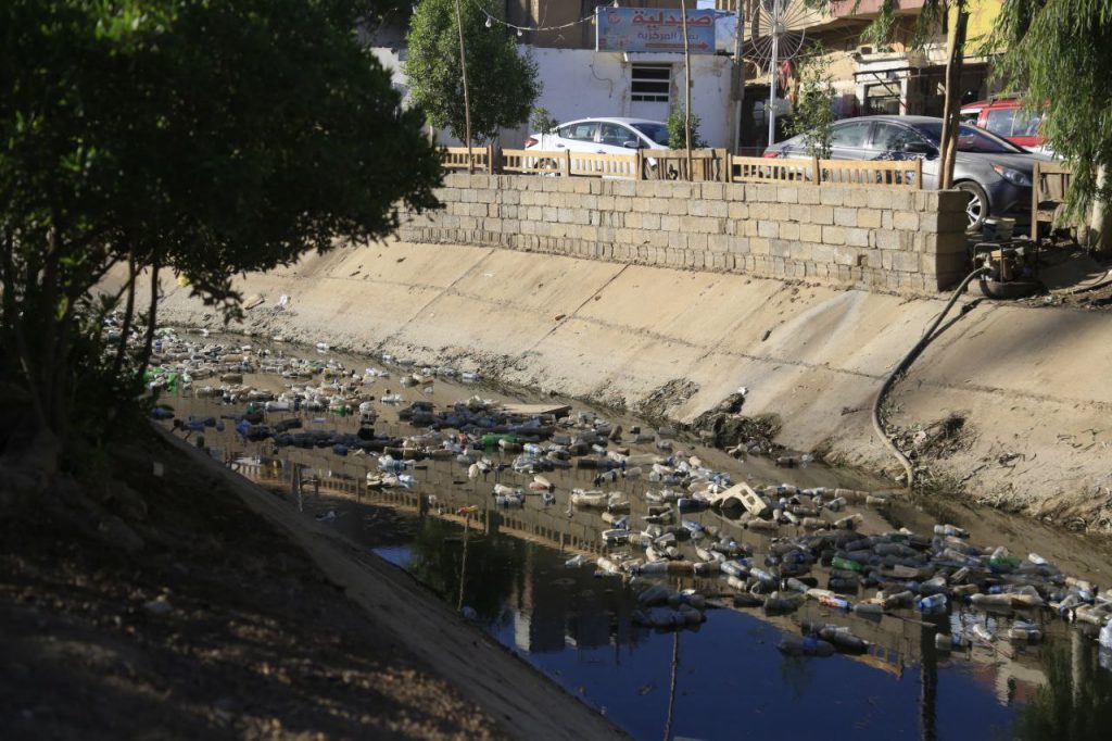 امتلأ نهر خريسان في ناحية بهرز في قضاء بعقوبة، بالنفايات ومياه الصرف الصحي.