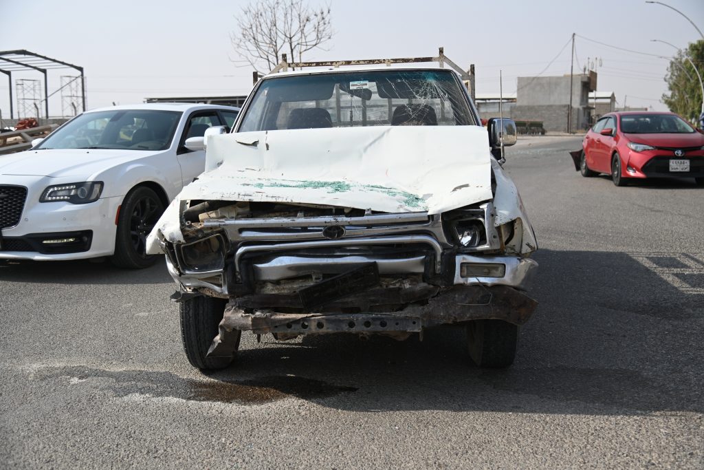 واصطدمت سيارة تويوتا كورولا بسياشاحنة صغيرة من الطراز القديم.