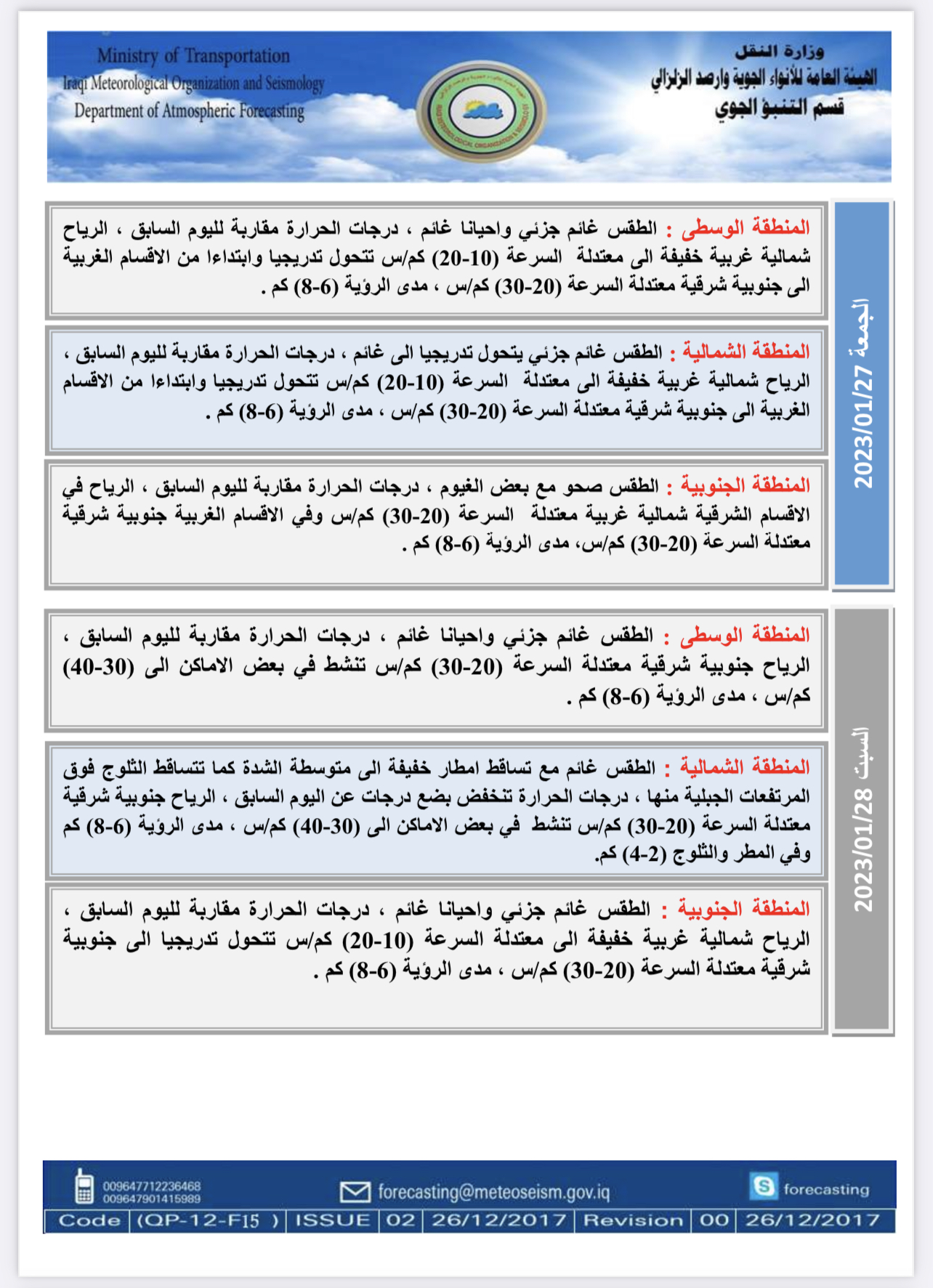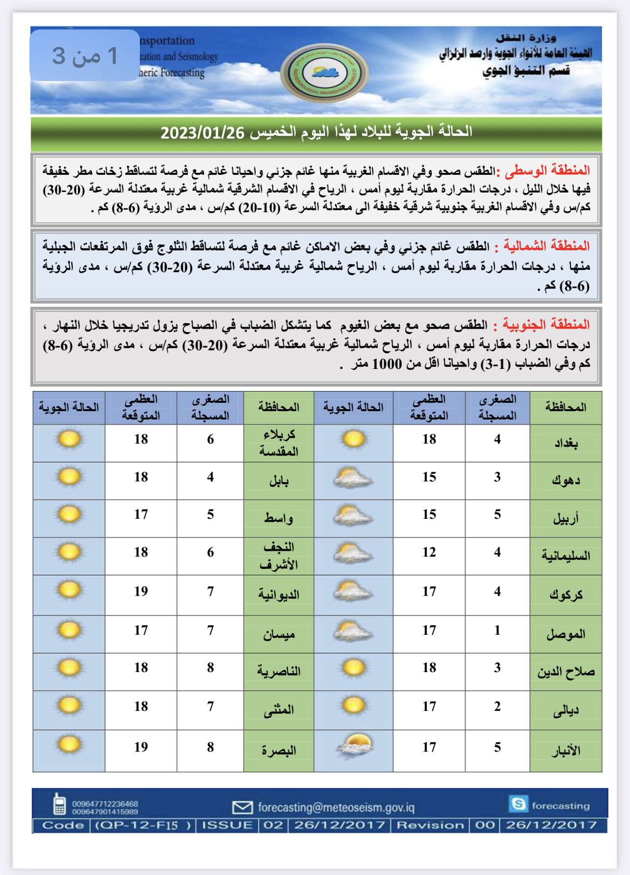 أصدرت هيئة الأنواء الجوية، تقريراً مفصّلاً بحالة الطقس لليوم الخميس، واليومين المقبلين في عموم البلاد.