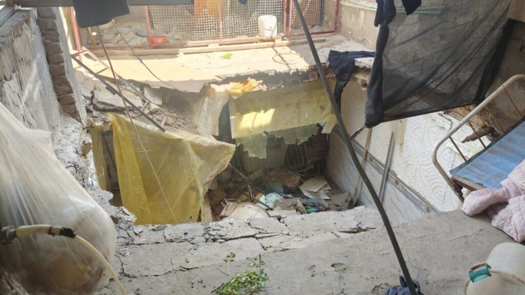 بحدود الساعة السادسة صباحاً تفاجأنا بانهيار سقف غرفة الاستقبال في منزل بيت عمي بسبب استخدام “القارة” في حفريات مشروع مجاري الحلة القريبة من المنزل.