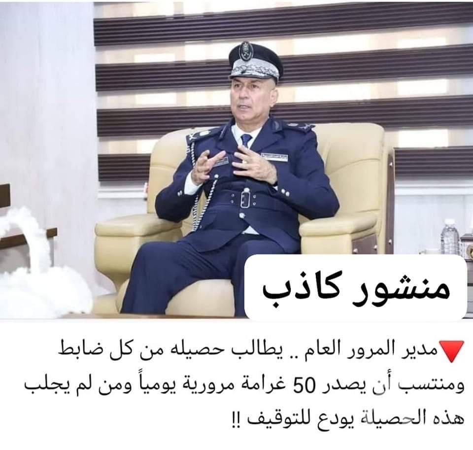 نفت مديرية المرور العامة، الخميس، صحة منشور تداولته صفحات على مواقع التواصل الاجتماعي، حول مطالبة منتسبي المرور بإصدار 50 غرامة مرورية يومياً، مع توقيف أي منتسب لم ينفذ ذلك.