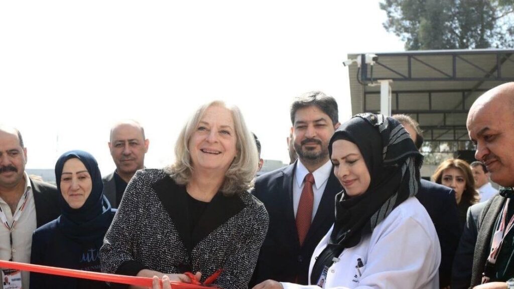 محافظ نينوى نجم الجبوري والسفيرة الأميركية ألينا رومانوسكي يفتتحان معمل المحاليل الوريدية في أيسر الموصل.
